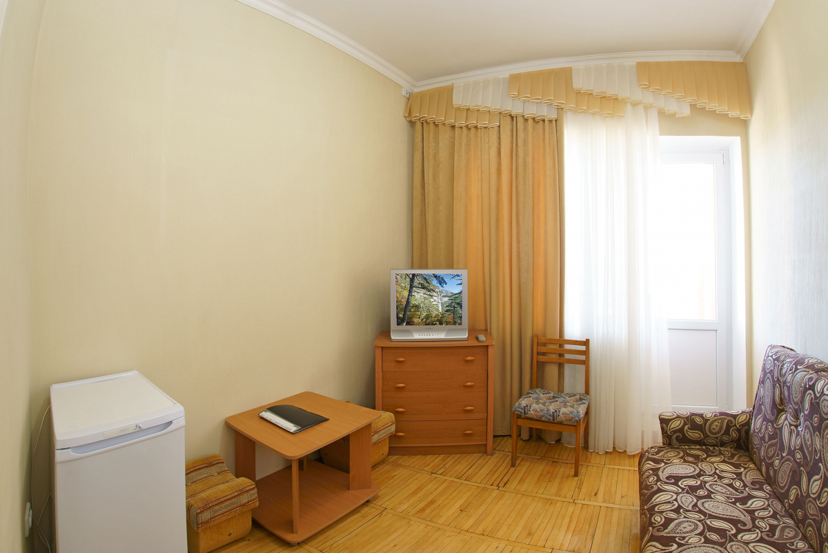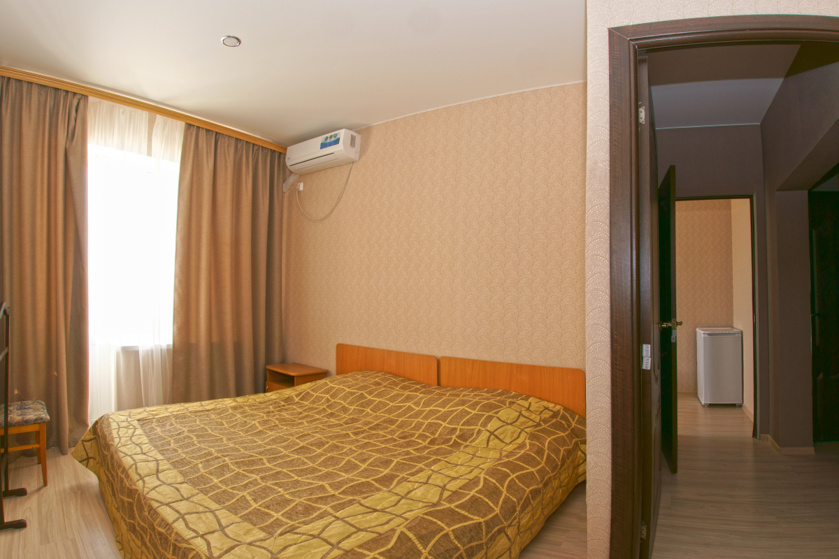 Площадь номера - 25 кв.м. 2 осн. места. 2 доп. места. Балкон. Мебель: диван раскладной, кровать двуспальная, прикроватные тумбочки, стол, стулья, шкаф. Оборудование: телевизор, холодильник. Санузел. Сервис: Wi-Fi бесплатно, смена полотенец, смена постельного белья, уборка номера.