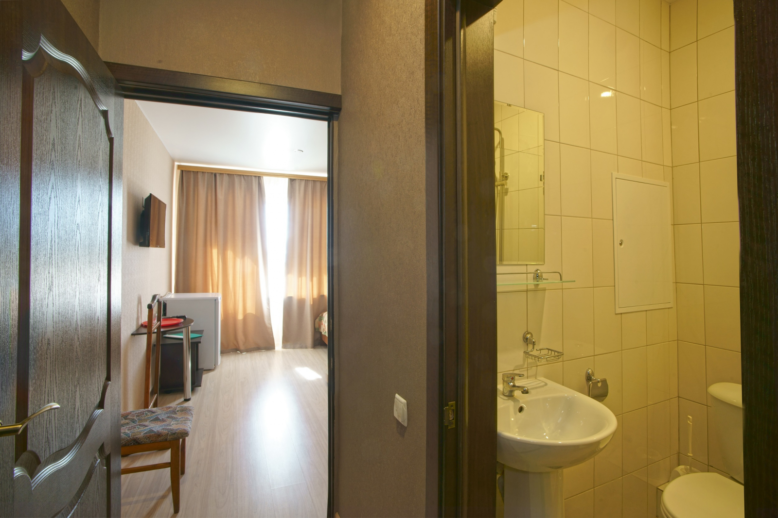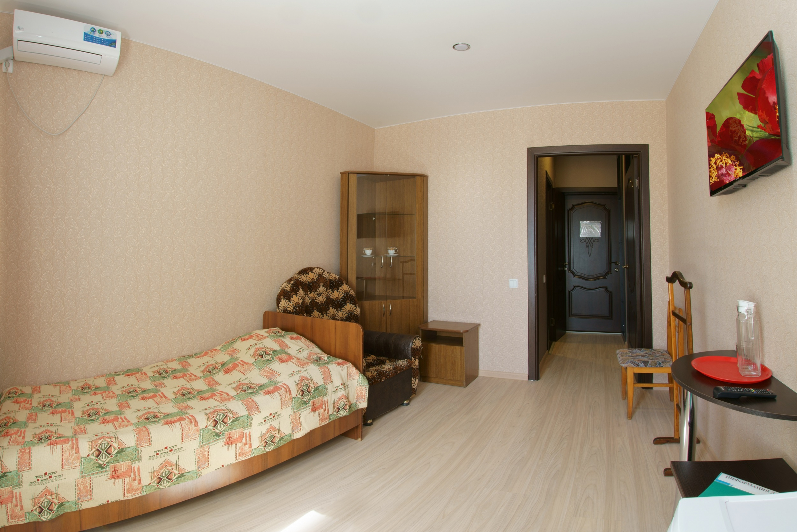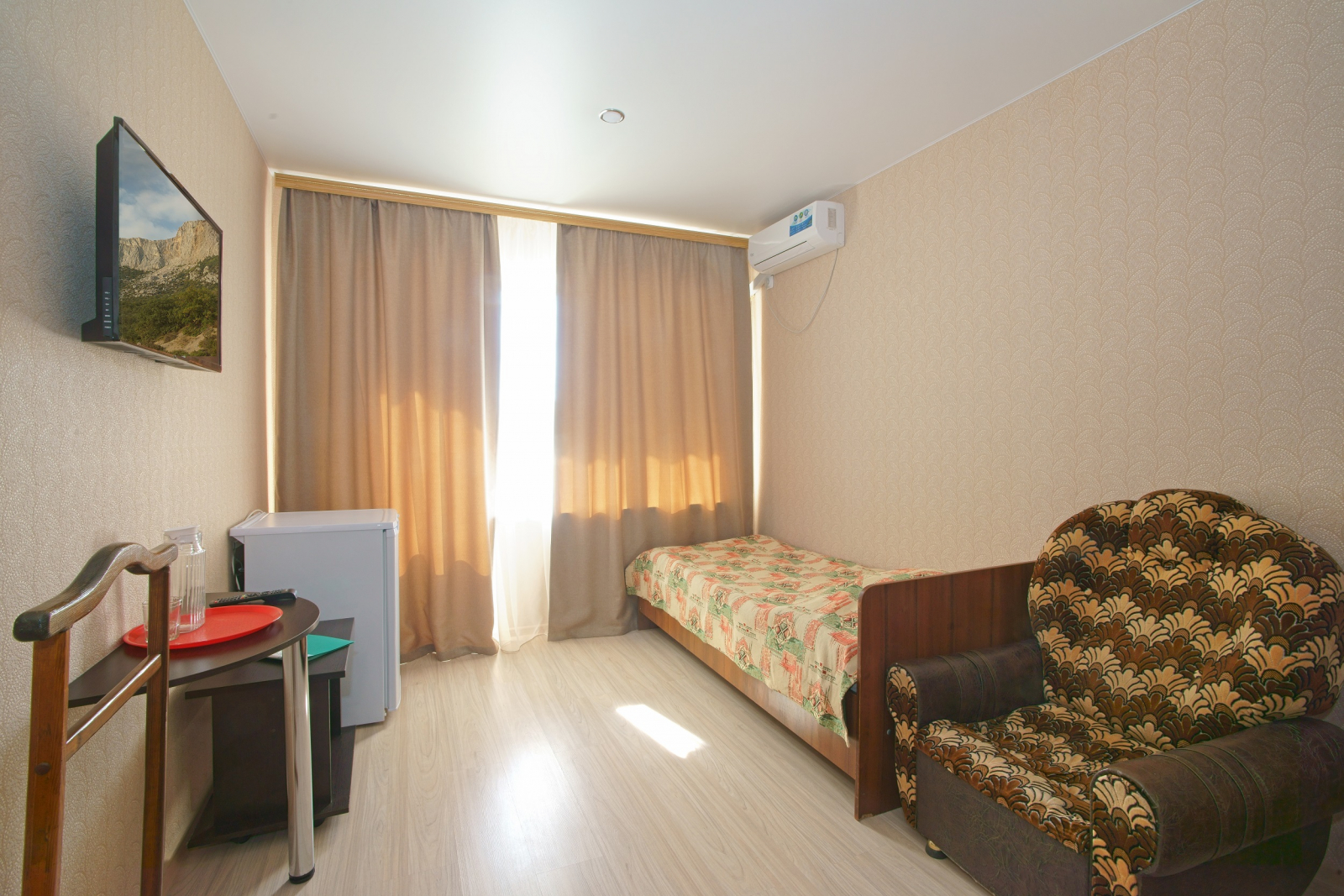 Площадь номера - 14 кв.м. 1 осн. место. 1 доп. место. Балкон. Мебель: зеркало, кровать односпальная, прикроватные тумбочки, стол, стулья, шкаф. Оборудование: кондиционер, телевизор, холодильник. Санузел. Сервис: Wi-Fi бесплатно, смена полотенец, смена постельного белья, уборка номера.