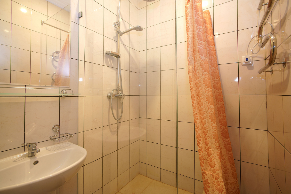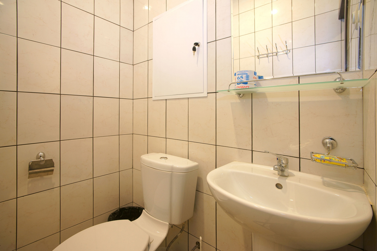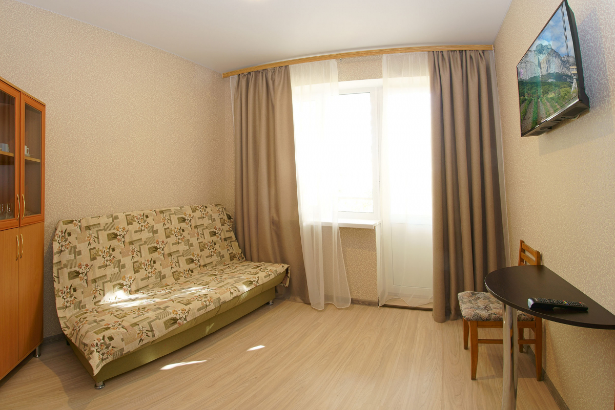 Площадь номера - 25 кв.м. 2 осн. места. 2 доп. места. Балкон. Мебель: диван раскладной, кровать двуспальная, прикроватная тумбочка, стол, стулья, шкаф. Оборудование: кондиционер, телевизор, холодильник. Санузел. Сервис: Wi-Fi бесплатно, смена полотенец, смена постельного белья, уборка номера.