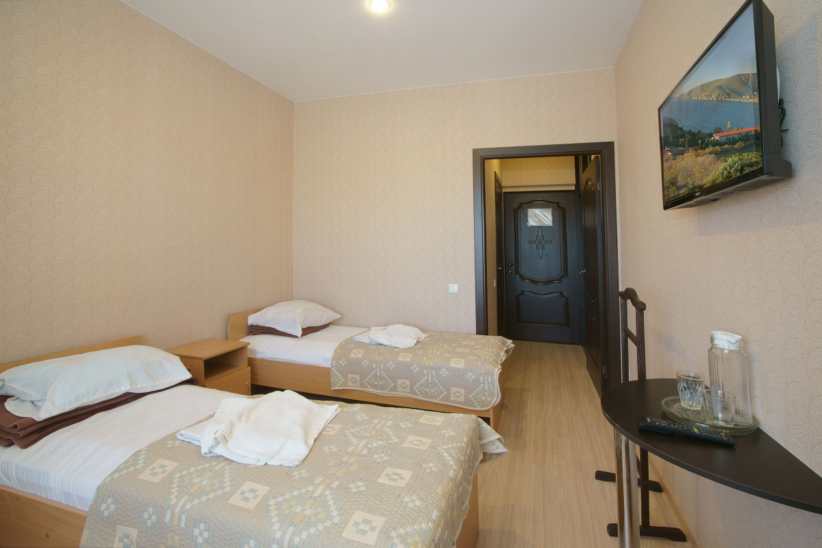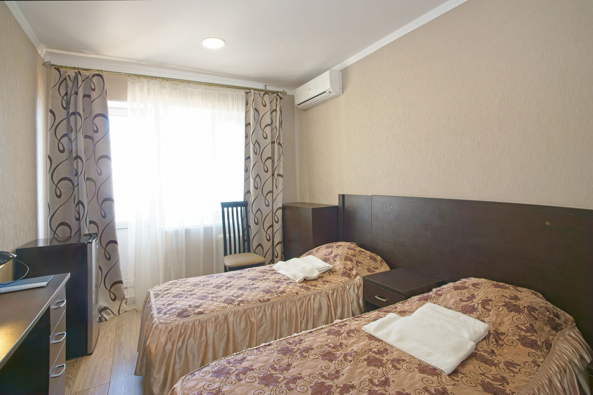 Площадь номера - 14 кв.м. 2 осн. места. 1 доп. место. Балкон. Мебель: зеркало, кровати односпальные, прикроватные тумбочки, стол, стулья, шкаф. Оборудование: кондиционер, телевизор, холодильник. Санузел. Сервис: Wi-Fi бесплатно, смена полотенец, смена постельного белья, уборка номера.